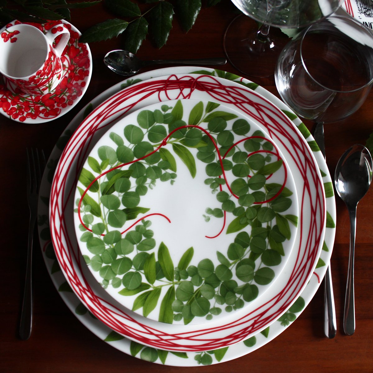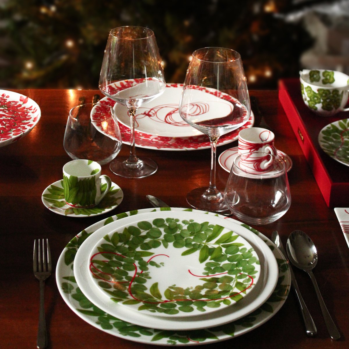A thin FIL ROUGE wreaths among twines of Eucalyptus and Laurel leaves. The green colour masters the scene and instils serenity, while a touch of red colour warms your heart.