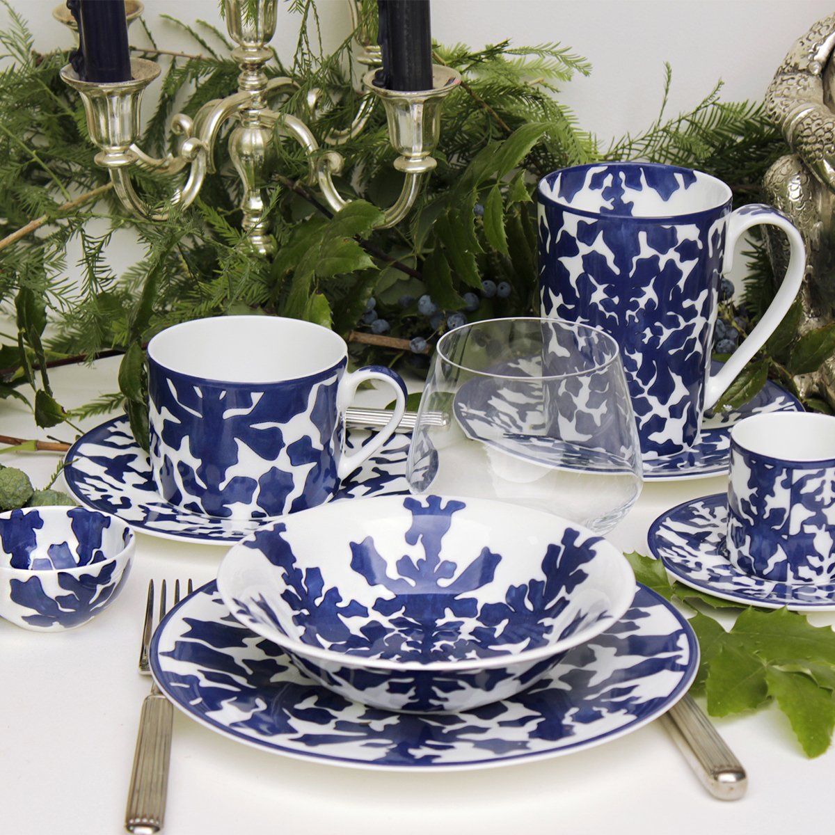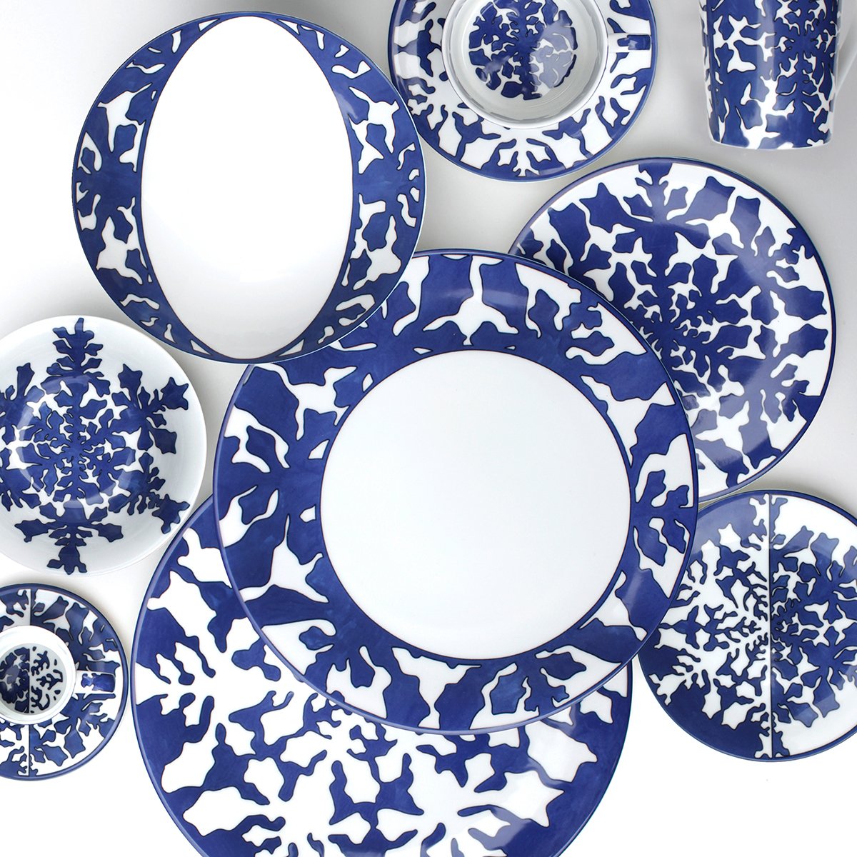 Elegant and contemporary, IMAGINE Collection, made of Luxury Fine Bone, is the first TAITÙ blue Collection: a natural and abstract world where everyone can freely imagine the forms that most express their own personality. The artistic approach originates from the uniqueness of Nature and from the geometries of natural elements (like snowflakes and seaweed). INNOVATION is the characteristic feature of IMAGINE Collection: a “game” from realistic to abstract drawing, the combination between positive and negative, and the proposal of “out of scheme” placements, like in the dinner and coupe soup plates.