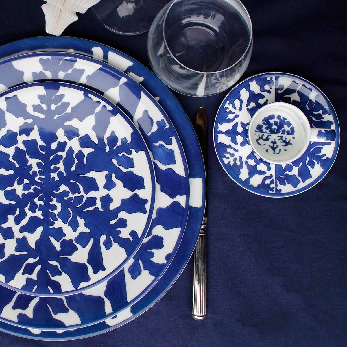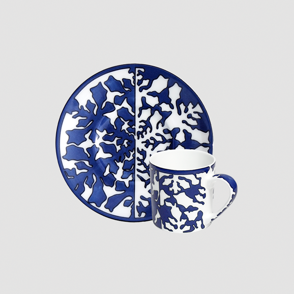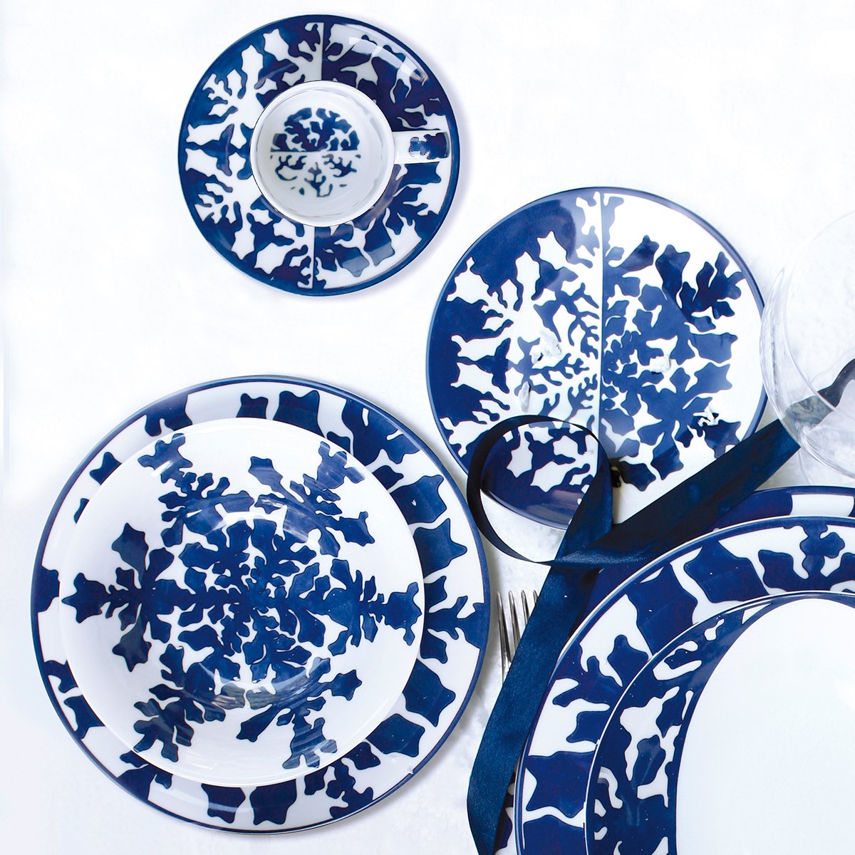 Elegant and contemporary, IMAGINE Collection, made of Luxury Fine Bone, is the first TAITÙ blue Collection: a natural and abstract world where everyone can freely imagine the forms that most express their own personality. The artistic approach originates from the uniqueness of Nature and from the geometries of natural elements (like snowflakes and seaweed). INNOVATION is the characteristic feature of IMAGINE Collection: a “game” from realistic to abstract drawing, the combination between positive and negative, and the proposal of “out of scheme” placements, like in the dinner and coupe soup plates.