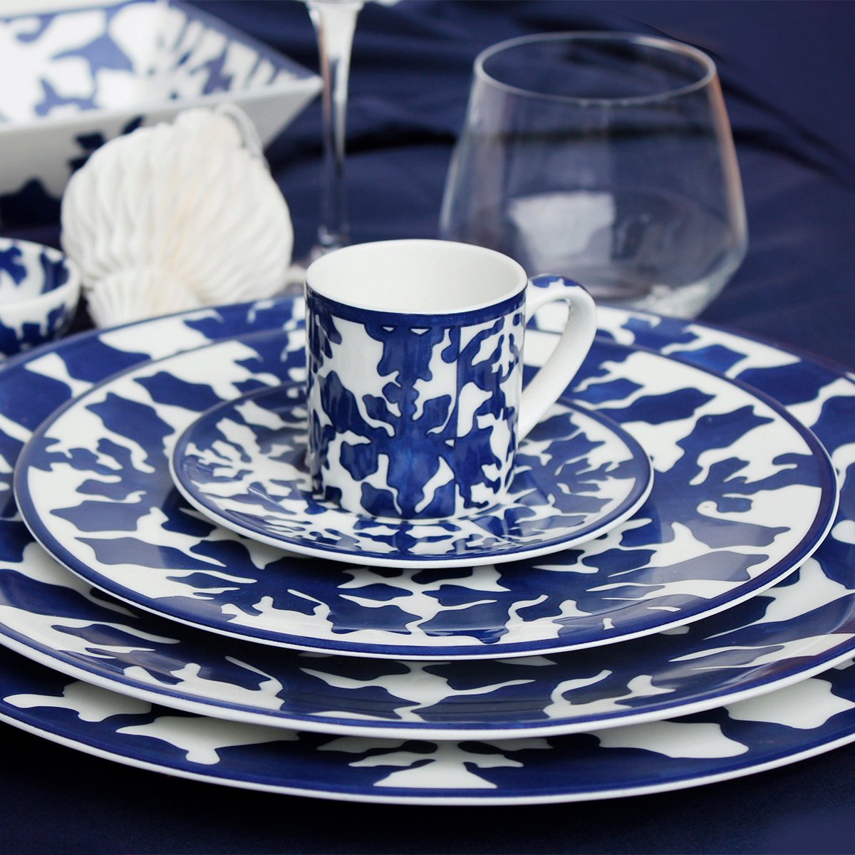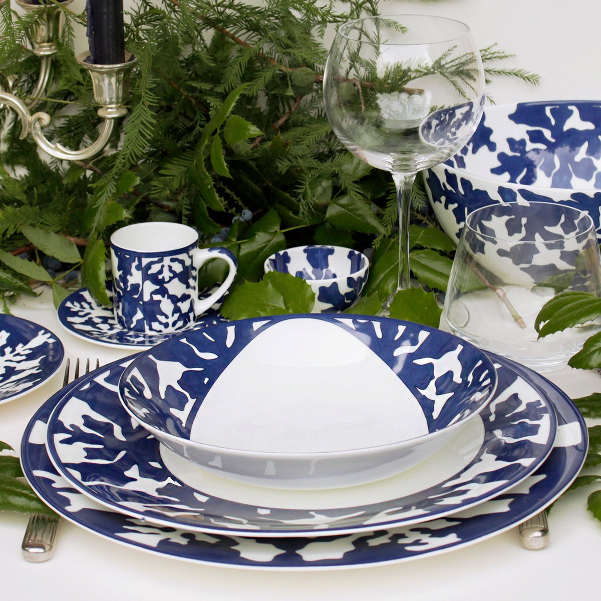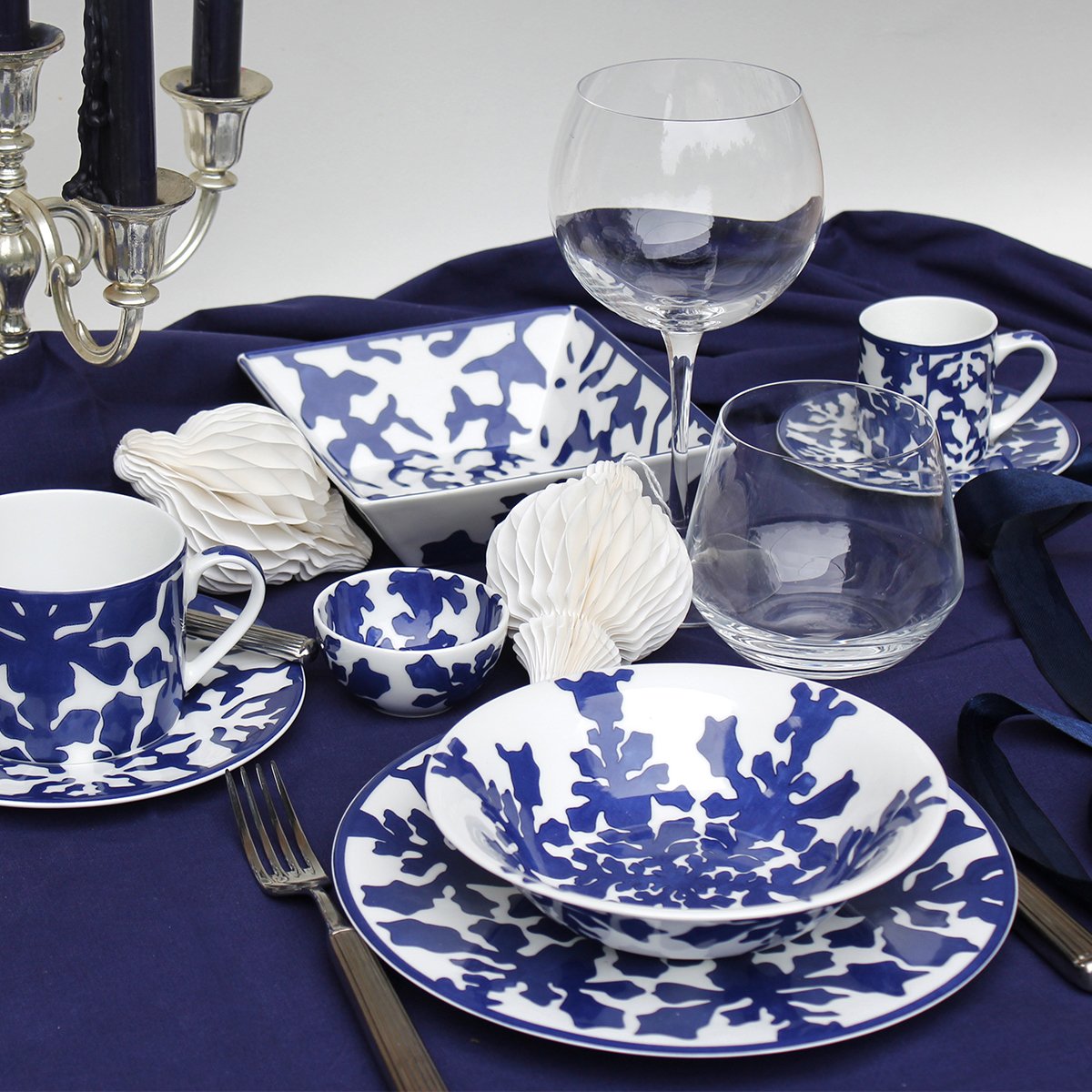 Elegant and contemporary, IMAGINE Collection, made of Luxury Fine Bone, is the first TAITÙ blue Collection: a natural and abstract world where everyone can freely imagine the forms that most express their own personality. The artistic approach originates from the uniqueness of Nature and from the geometries of natural elements (like snowflakes and seaweed). INNOVATION is the characteristic feature of IMAGINE Collection: a “game” from realistic to abstract drawing, the combination between positive and negative, and the proposal of “out of scheme” placements, like in the dinner and coupe soup plates.